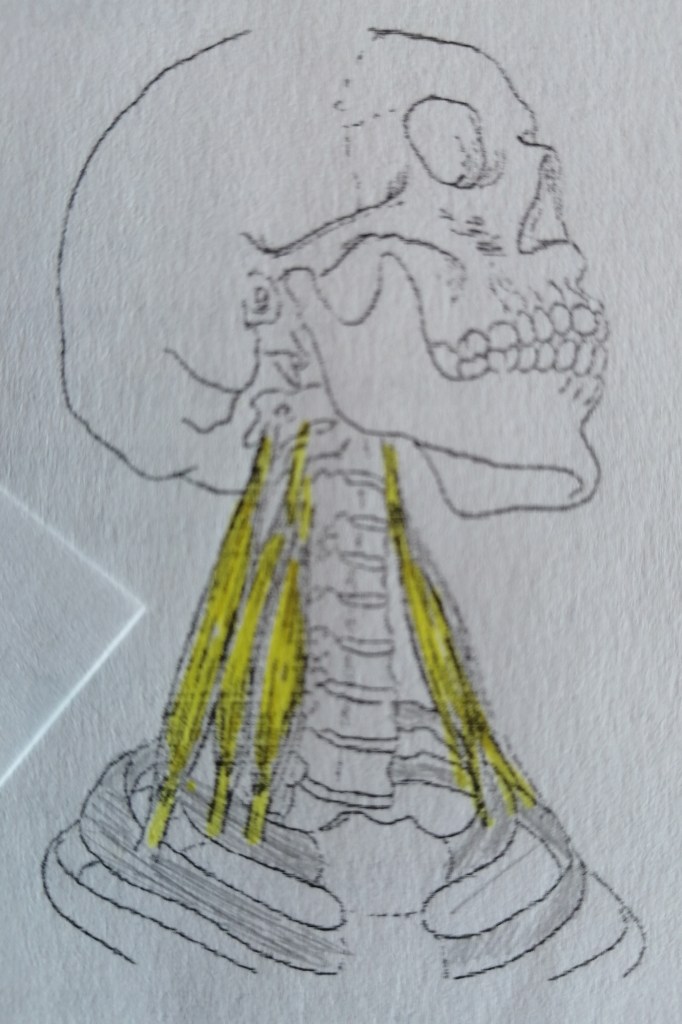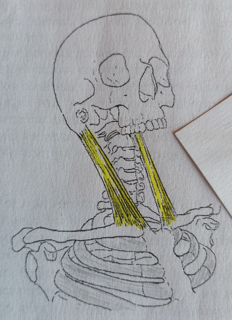Si je place mes doigts derrière les oreilles près des cervicales, en inspirant je peux sentir les insertions des muscles sterno-cléido-mastoïdiens qui se durcissent (sterno = sternum, cléido = clavicules, mastoïdien = processus mastoïdes des os temporaux derrière les oreilles). Quand j’inspire je tire le sternum et les clavicules vers le haut avec ces muscles qui sont donc attachés aux deux côtés du haut de ma nuque.