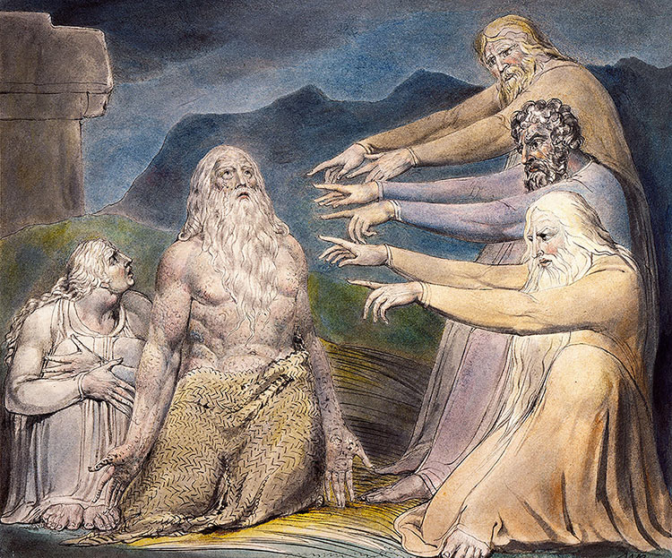 Au début, les amis de Job pensent que Job est responsable de ses propres malheurs. Si Job souffre, c’est forcément parce qu’il a péché, au sens où il est coupable de naïveté, il n’a pas assez anticipé le fait que le malheur arrive à tout le monde, vie exemplaire ou pas.