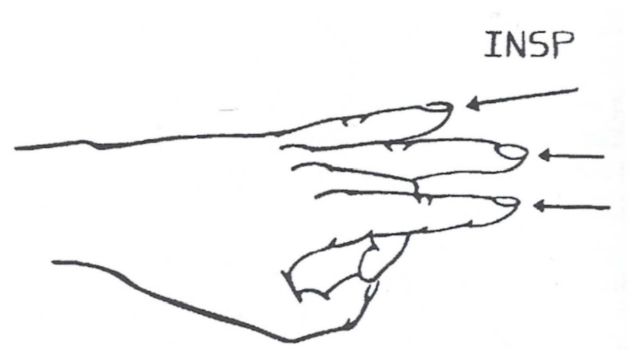 2) Porter l’attention sur la main gauche, joindre l’ongle du majeur gauche et l’intérieur du pouce gauche, essayer de tendre les trois doigts libres. Inspirer profondément.