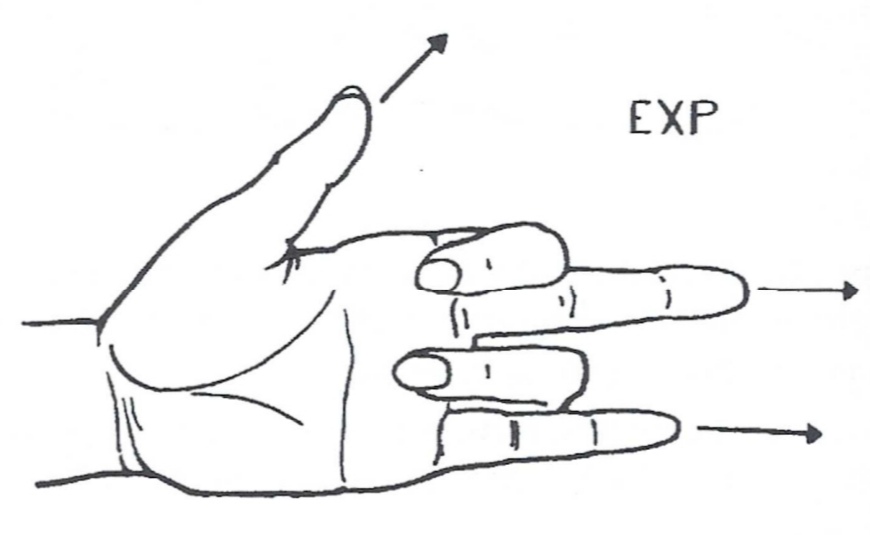 3) Toujours main gauche, tourner la paume vers le ciel, libérer le majeur, le tendre, et ramener les deux doigts latéraux du majeur vers la paume (index et annulaire), essayer de tendre les trois doigts lbres. Expirer profondément.